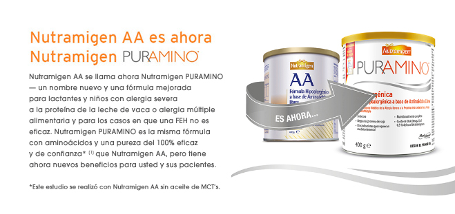 Nutramigen PURAMINO es una fórmula basada en aminoácidos para el tratamiento dietético de los lactantes y niños pequeños con alergia severa a las proteínas de leche de vaca y alergia múltiple alimentaria, y para los casos en que la fórmula extensamente hidrolizada es ineficaz.