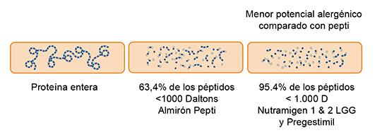 El perfil de pesos moleculares de las fórmulas extensamente hidrolizadas (FEH) es una característica importante para determinar su posible actividad alergénica residual [Bindels 1994]